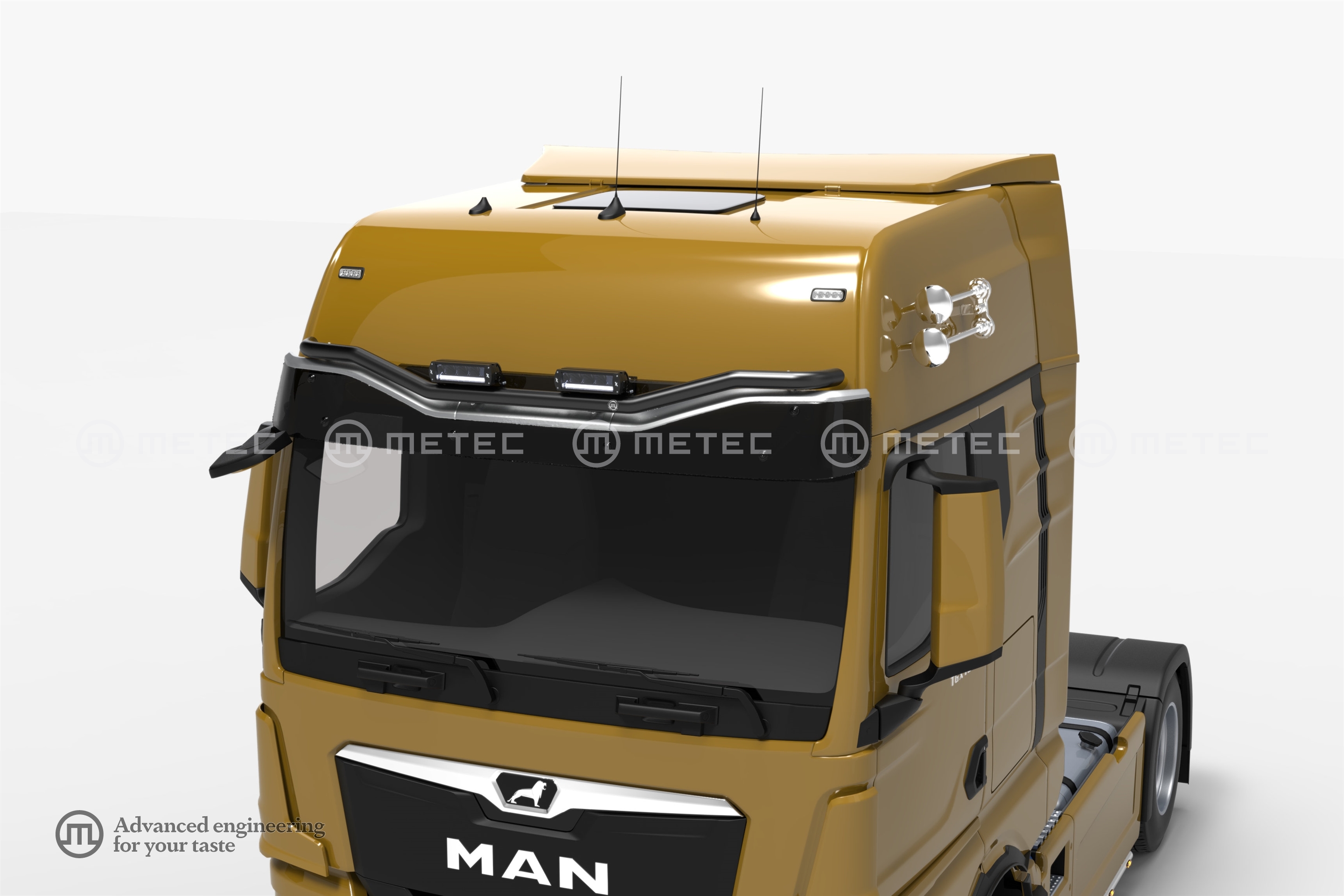 | Additional info | For the trucks with INDIVIDUAL/AERO sun visors only! Possible to mount 2x 280mm ledbar type extralights. Max. width, straight of the tube is 720mm. |